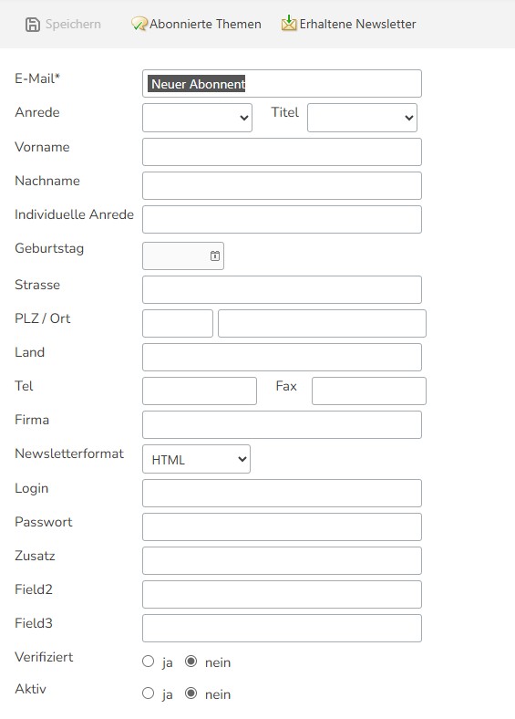 Die Felder Verifiziert und Aktiv sind standardmäßig auf Nein gestellt. Im Falle einer Verifizierung (der neue Abonnent muss in einer an ihn gerichtete Email über einen Link seine Emailadresse identifizieren) werden sie auf Ja gesetzt.