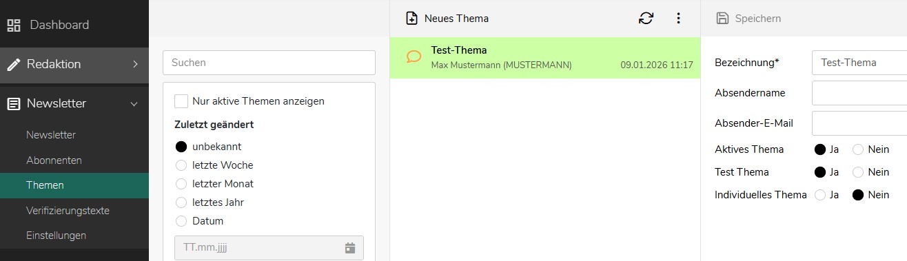 Falls Sie nicht nur einen Unternehmensnewsletter versenden möchten, sondern Newsletter zu bestimmten Themen anbieten wollen, verwalten Sie unterschiedliche Themen in der Themenverwaltung.